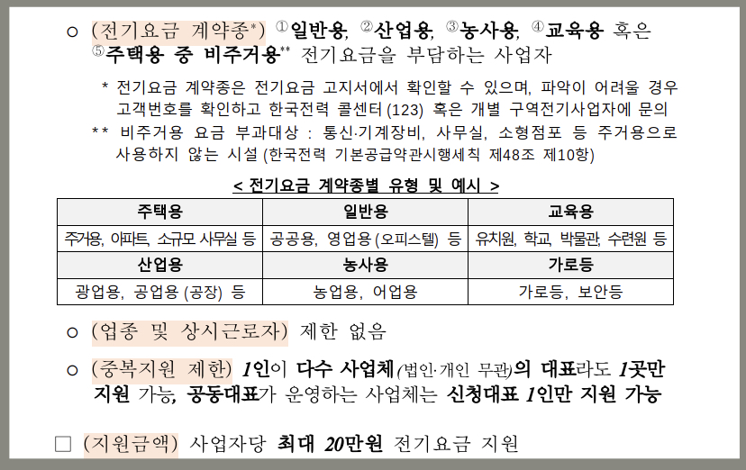 • 지원대상: 공고일 기준 활동 중, 연 매출액 3,000만원 이하, 사업장용 전기요금 (주거용 등 제외)을 부담하는 개인·법인사업자