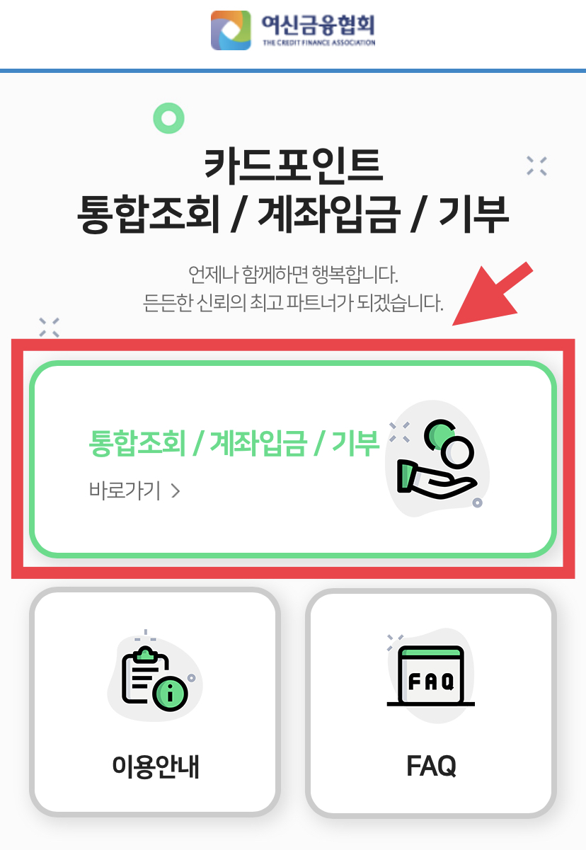 카드포인트 통합조회 화면에서 통합조회/계좌입금/기부 항목을 선택합니다.