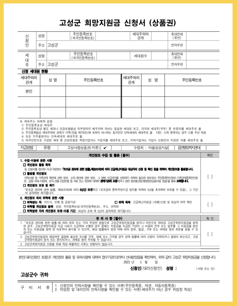 - 신청대상: 2023. 2. 28일 기준 고성군에 주민등록을 둔 고성군민. 지급일 현재까지 거주, 3.1일이후 사망 등 말소자 제외