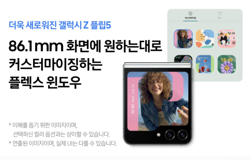 갤럭시 Z플립5는 커버 스크린이 약 86.1㎜로 커졌으며 플렉스 윈도우 등의 디자인이 바뀌었습니다. 그리고, 갤럭시 Z플립5와 Z폴드5는 물방울 구조로 접히는 플렉스 힌지를 적용했다는 점이 가장 두드러집니다.