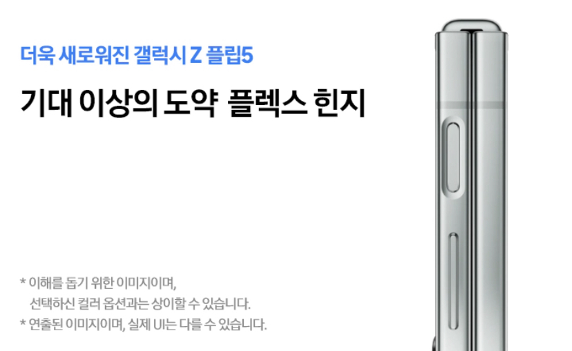 갤럭시 Z플립5는 커버 스크린이 약 86.1㎜로 커졌으며 플렉스 윈도우 등의 디자인이 바뀌었습니다. 그리고, 갤럭시 Z플립5와 Z폴드5는 물방울 구조로 접히는 플렉스 힌지를 적용했다는 점이 가장 두드러집니다.