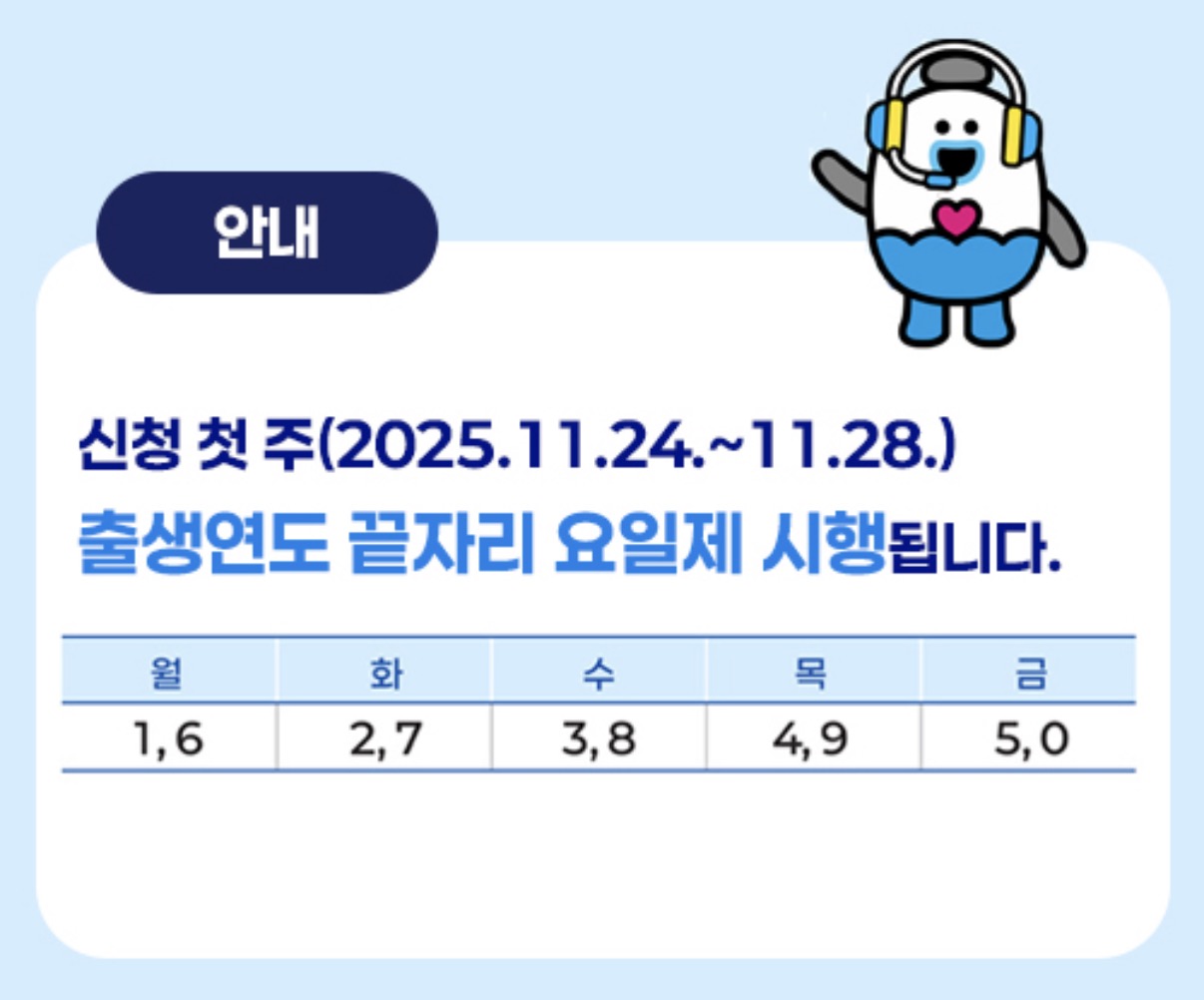 - 신청 첫 주(11/24~11/28)에는 출생연도 끝자리 요일제를 운영하므로 방문 신청 시 이 점도 유의해야 합니다.