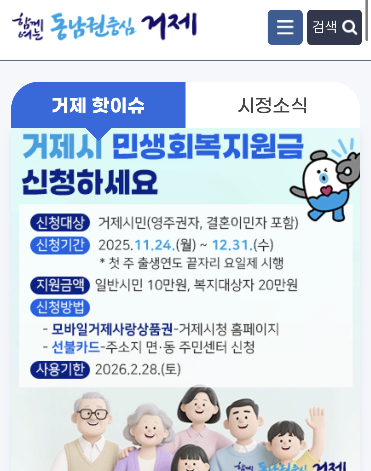 - 지급 기준일 이전에 거제시에 주민등록 또는 체류지 등록이 되어 있어야 합니다.