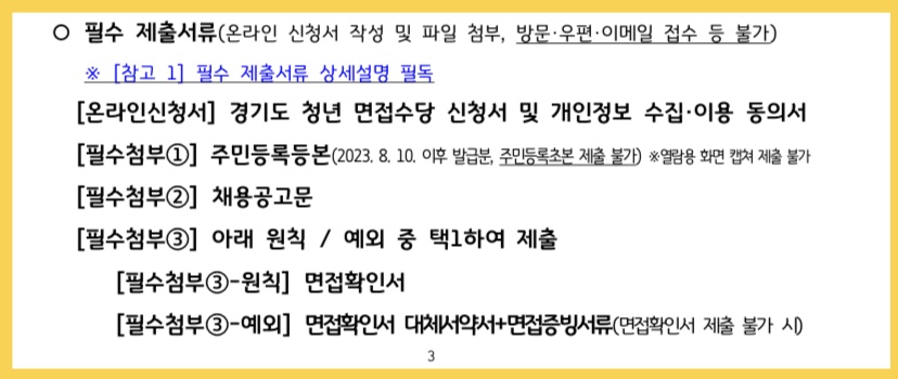 - 필수 제출서류(온라인 신청서 작성 및 파일 첨부, 방문·우편·이메일 접수 등 불가): 온라인 작성/경기도 청년 면접수당 신청서 및 개인정보 수집·이용 동의서, 주민등록등본(2023. 8. 10. 이후 발급분, 주민등록초본 제출 불가), 채용공고문, 면접확인서(면접확인서 제출 불가 시 면접확인서 대체서약+면접증빙서류로 제출 가능)