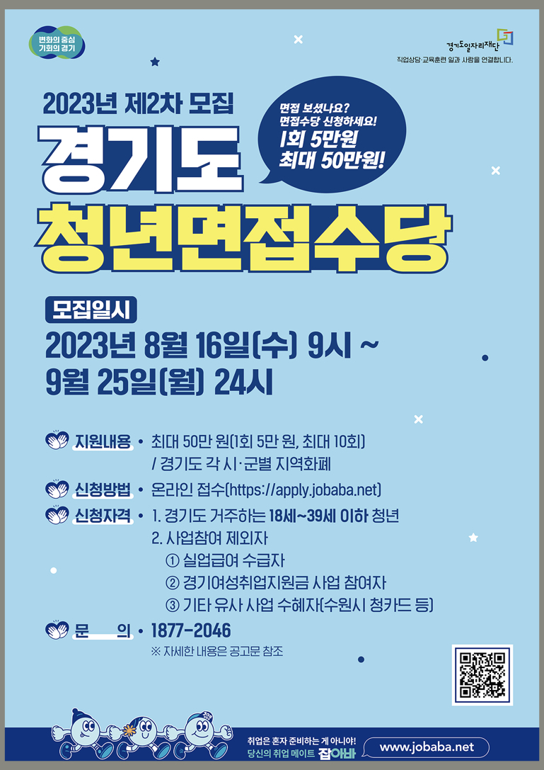 경기도와 경기도일자리재단은 2023년 8월 16일부터 9월 25일까지 2023년 청년면접수당 2차 모집을 합니다. 그럼 경기도 청년면접수당 신청방법 잡아바 홈페이지에 대해 자세히 알아보겠습니다.