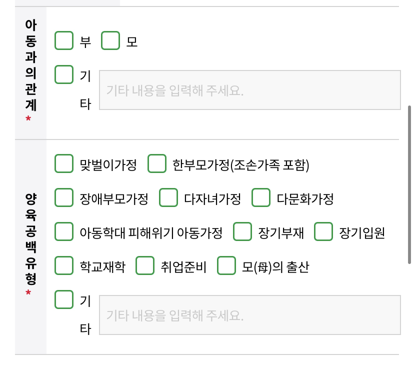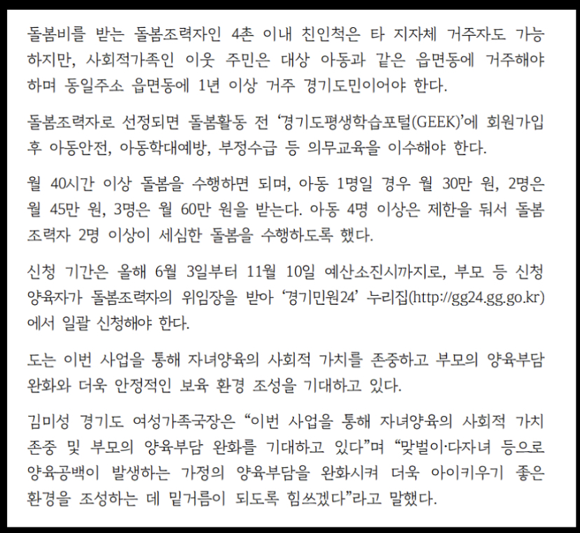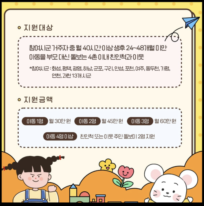 또한, 부모 등의 양육자와 생후 만 24~48개월의 아동이 주민등록상 경기도 거주자여야 하며 맞벌이 등 양육공백이 발생한 가정으로 소득제한은 없습니다.