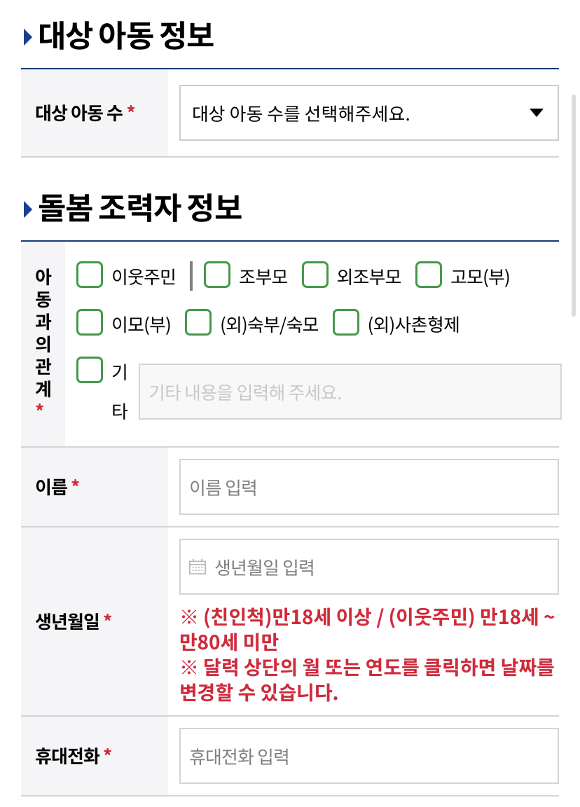 6. 대상 아동 정보와 돌봄 조력자의 정보를 입력합니다.