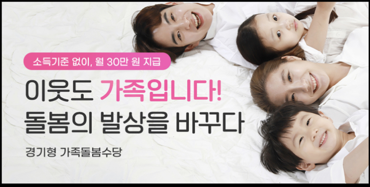 경기도는 생후 만 24~48개월 미만 아동을 돌보는 4촌 이내 친인척 또는 이웃주민에게 돌봄 아동수에 따라 월 30만에서 60만 원을 지원하는 경기형 가족돌봄수당 신청 접수를 시작합니다. 기간은 6월 3일부터 11월 10일까지이며 예산소진시까지 진행합니다. 그럼 경기형 가족돌봄 수당 조부모 손주 육아 신청 방법에 대해 자세히 알아보도록 하겠습니다.