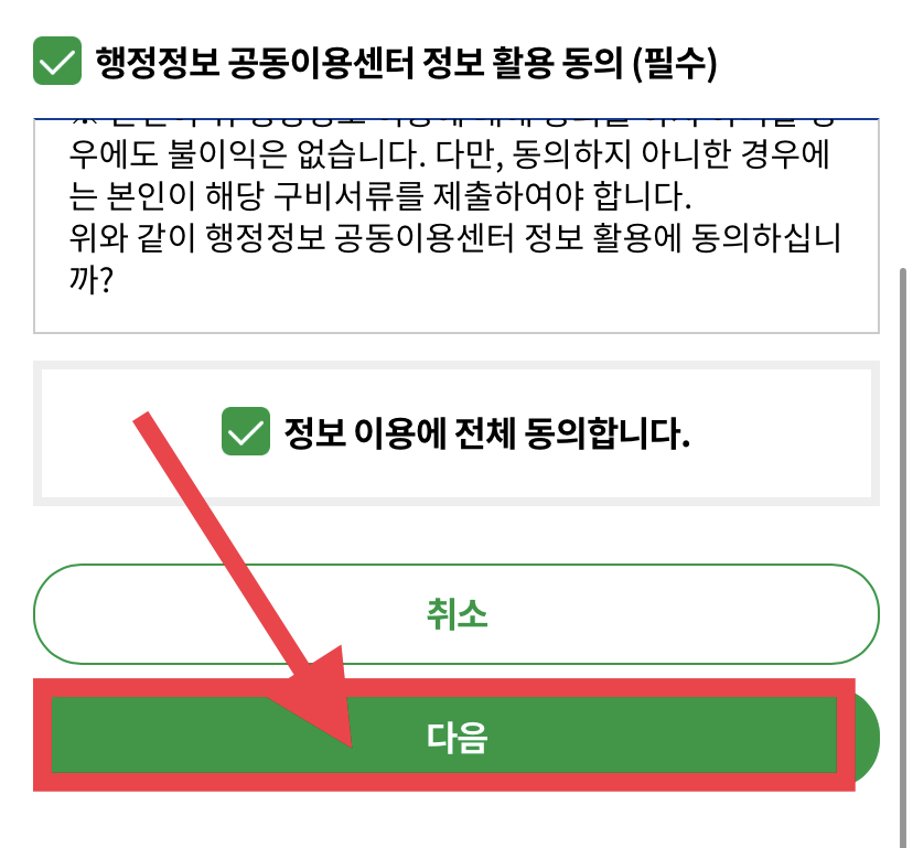 4. 정보이용 동의를 선택한 뒤 다음을 누릅니다.