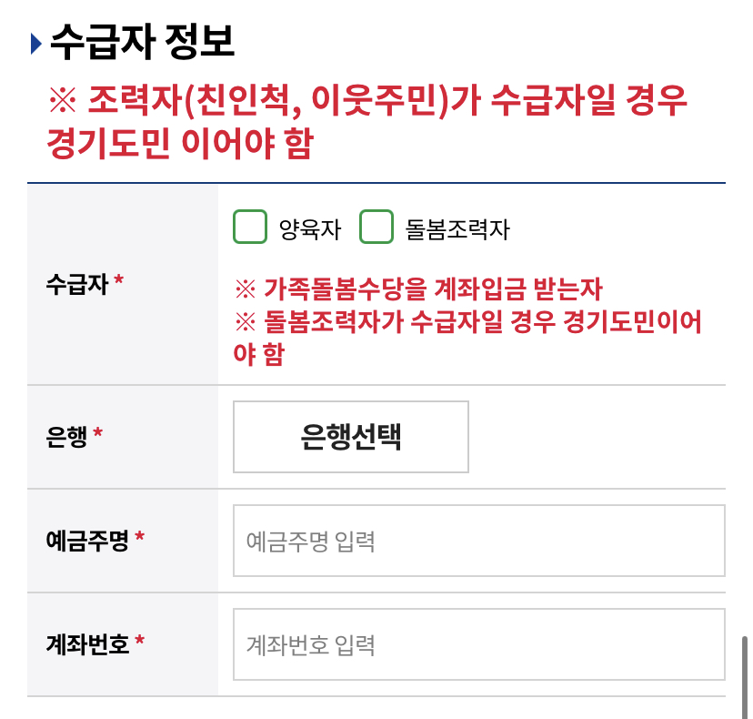 - 지원내용: 월 40시간 이상 돌봄 수행 시 돌봄비 계좌이체