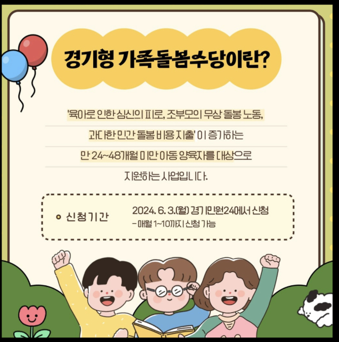 또한, 부모 등의 양육자와 생후 만 24~48개월의 아동이 주민등록상 경기도 거주자여야 하며 맞벌이 등 양육공백이 발생한 가정으로 소득제한은 없습니다.