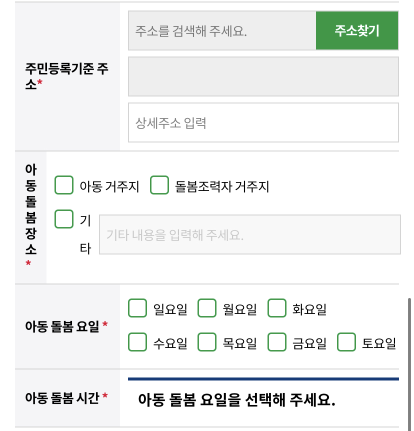 6. 대상 아동 정보와 돌봄 조력자의 정보를 입력합니다.