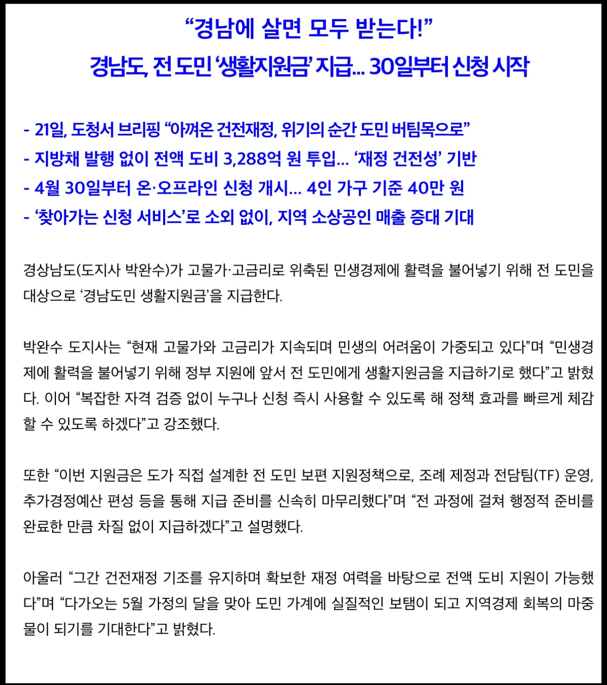 지급 금액은 1인당 10만 원이다. 4인 가족은 40만 원, 5인 가족은 50만 원을 받게 됩니다. 총 재원은 3288억 원으로 지방채 발행 없이 전액 도비로 충당합니다. 박완수 도지사는 “건전재정 기조를 꾸준히 유지하며 쌓아온 재정 여력이 이번 지급을 가능하게 했다”고 밝혔습니다.