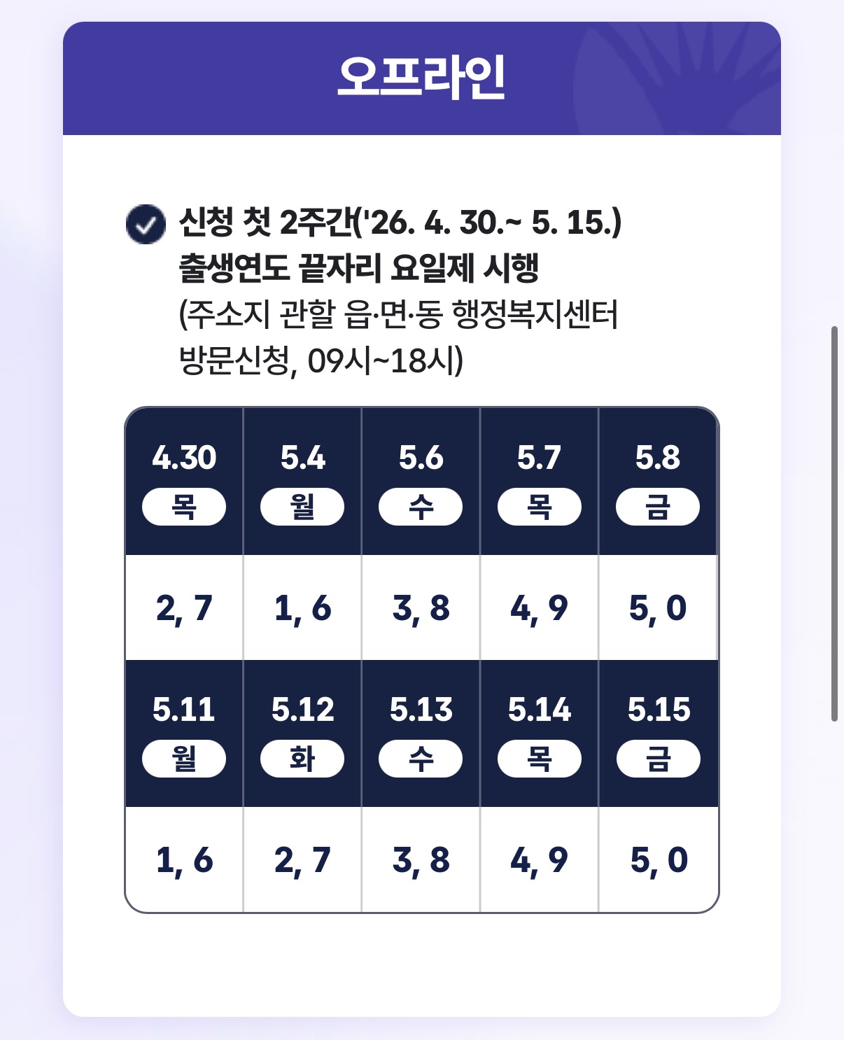 분산 신청제로 오프라인은 요일제를 적용해 끝자리 2·7은 4월 30일, 1·6은 5월 4일, 3·8은 5월 6일, 4·9는 5월 7일, 5·0은 5월 8일에 방문하면 된다.
