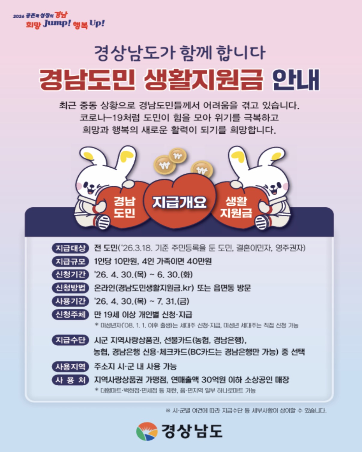 3월 18일 기준 경남도에 주민등록을 둔 모든 도민이 대상이며 신청 기간 출생한 신생아와 외국인 결혼이민자, 영주권자, 난민 인정자도 포함합니다.
