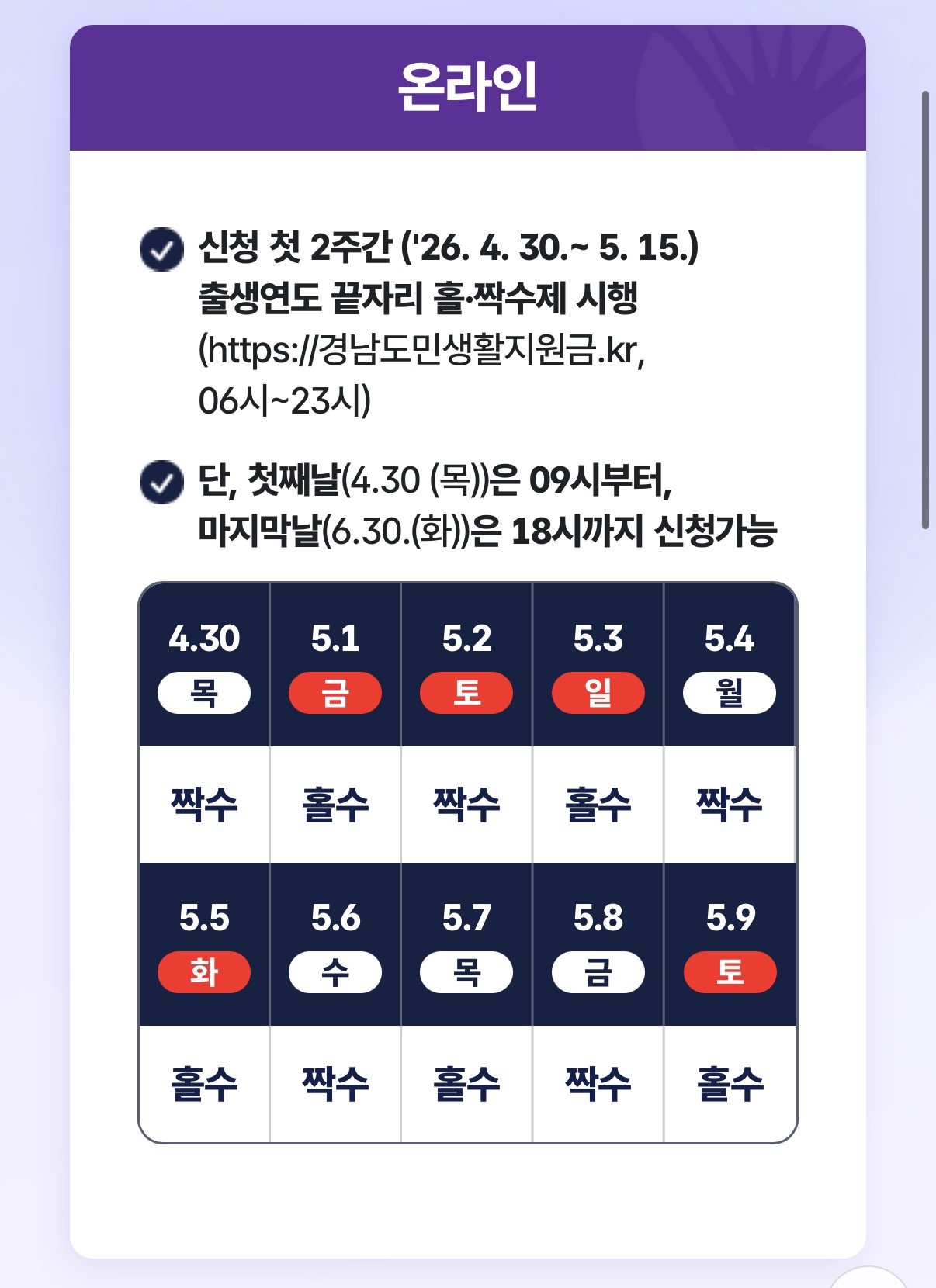 초기 혼잡과 시스템 과부하 방지를 위해 시행 첫 10일간 출생연도 끝자리를 기준으로 온라인은 ‘홀짝제’, 오프라인은 ‘요일제’를 운용합니다.