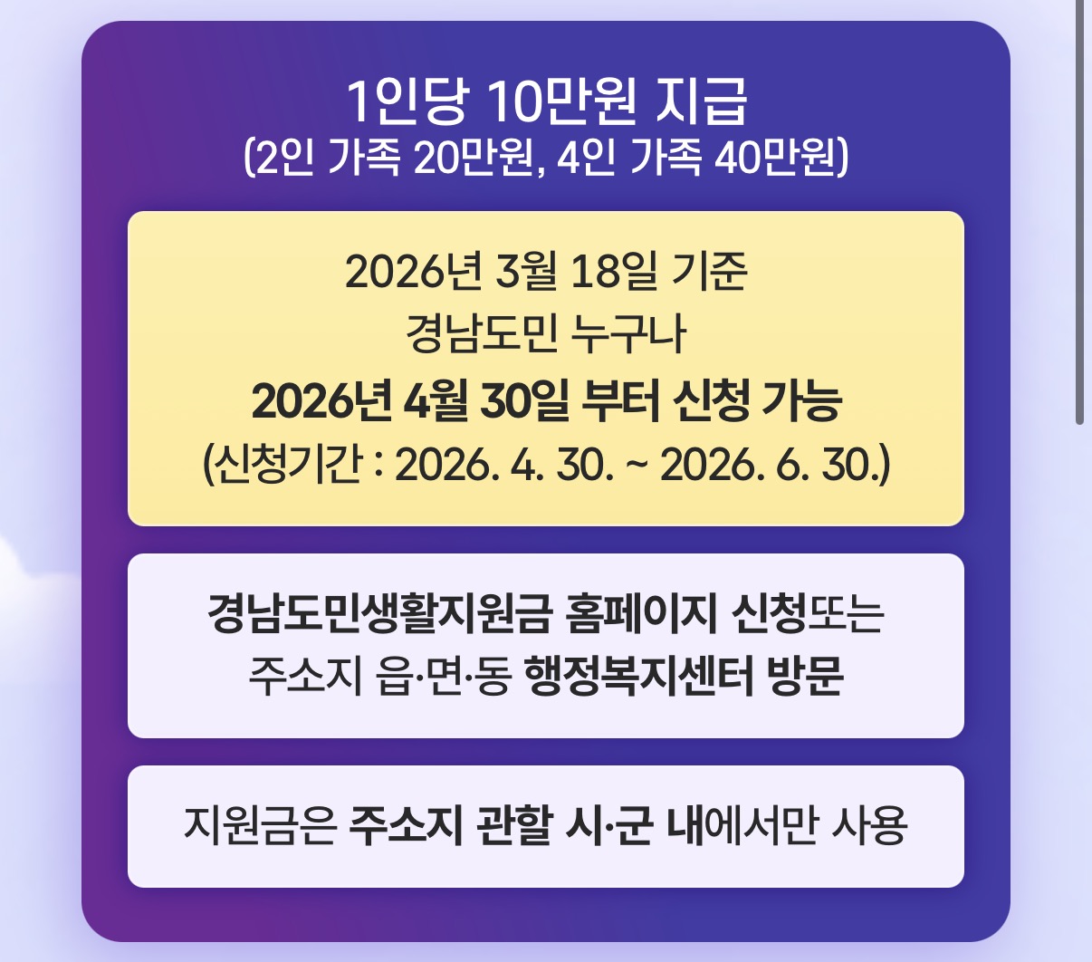 지급 기준일은 2026년 3월 18일이입니다. 이 날짜를 기준으로 경남에 주민등록이 돼 있는 사람이면 내국인은 물론 외국인 결혼이민자, 영주권자, 난민인정자까지 모두 지원 대상에 포함됩니다.