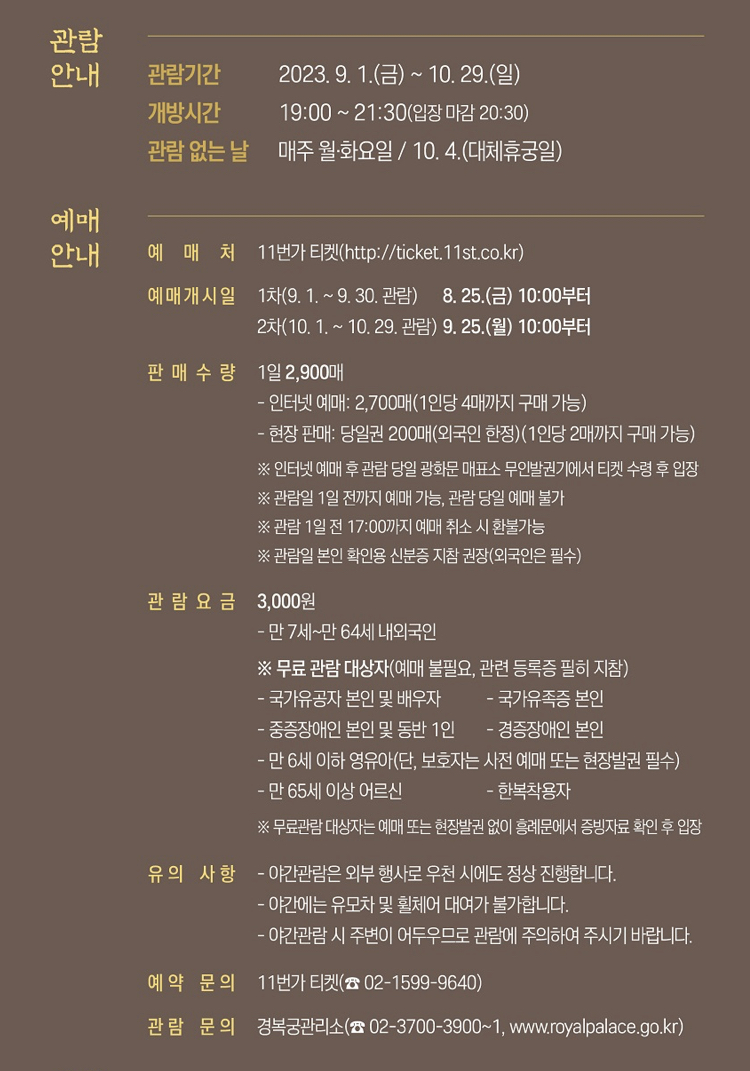 - 야간관람 없는 날: 야간관람 휴무(매주 월ㆍ화요일). 단, 10.4.(수)는 경복궁 대체휴궁일로 야간관람 없음)
