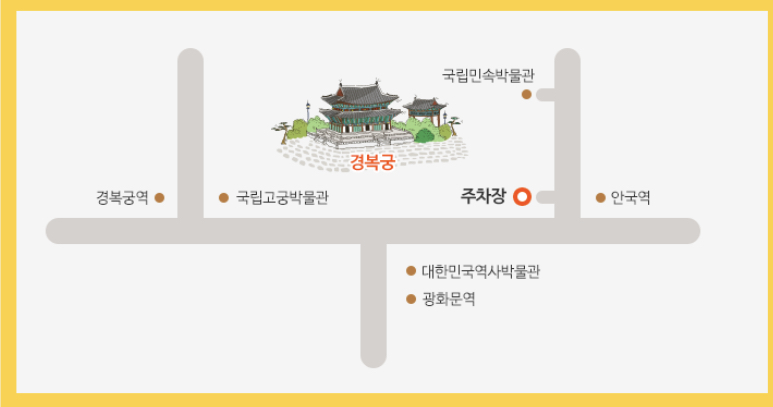 경복궁 주차장은 안국역과 경복궁 사이에 위치하고 있습니다. 지상 주차장은 관광버스 주차장이고 지하 주차장은 승용차를 주차하실 수 있는 곳입니다.