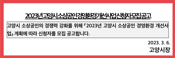 경기도 고양시는 물가상승 및 경기 불황으로 경영에 어려움을 겪고 있는 소상공인을 위해 지원을 시작합니다. 고양시는 3월 24일까지 2023년 고양시 소상공인 경영환경 개선사업의 신청자를 모집하는데요. 그럼 고양시 소상공인 경영환경 개선 지원 300만원 신청방법 홈페이지에 대해 자세히 알아보도록 하겠습니다.