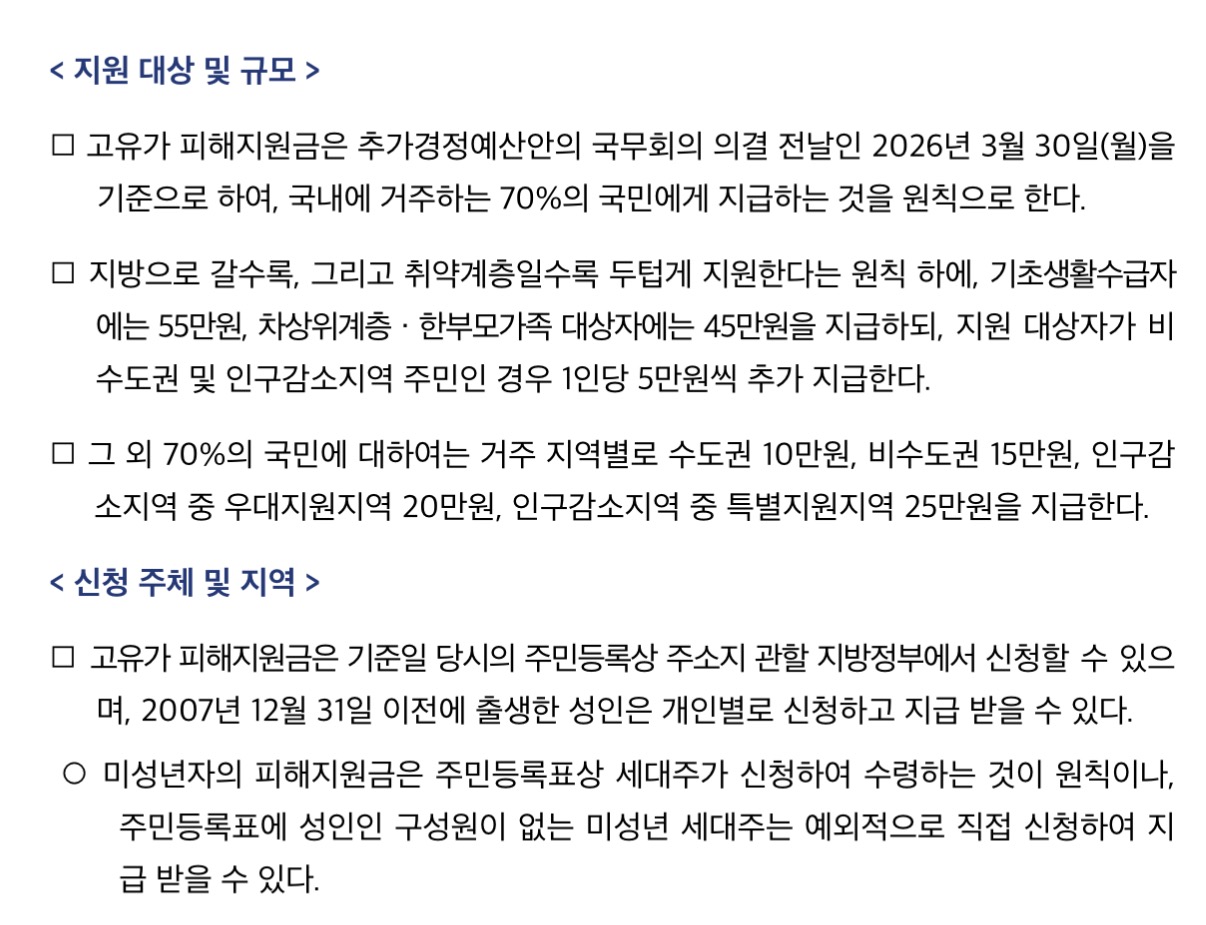 • 일반 국민(소득 하위 70%): 인프라가 부족하거나 인구 감소 지역에 더 두터운 혜택을 줍니다. 수도권은 10만 원부터 시작하지만, 인구감소 특별지역은 최대 25만 원까지 책정되었죠.