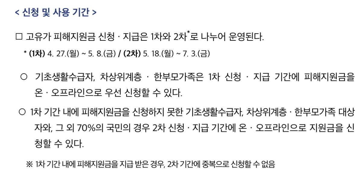 ○ 1차 기간 내에 피해지원금을 신청하지 못한 기초생활수급자, 차상위계층 · 한부모가족 대상자와, 그 외 70%의 국민의 경우 2차 신청 · 지급 기간에 온 · 오프라인으로 지원금을 신청할 수 있습니다.