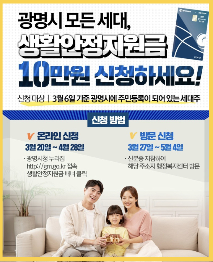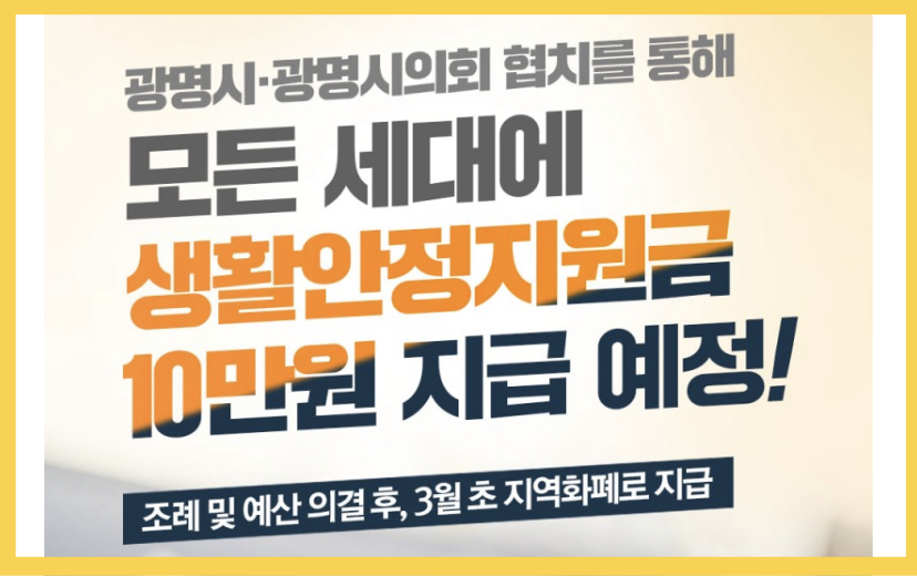 - 신청방법: 광명시 홈페이지 생활안정지원금 배너(3월 19일 개설)를 클릭하신 후 로그인해서 신청서 양식 작성하시면 됩니다.