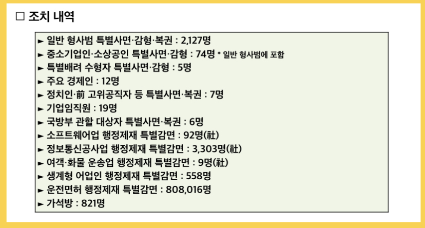 - 도로교통법위반, 수산업법위반 등 8개 생계형 행정법규 위반 사범 및 교통사고처리특례법위반, 부정수표단속법위반, 감염병의예방및관리에관한법률위반 사범(감염병의예방및관리에관한법률 중 의료·방역물품 무단 국외반출, 무허가 고위험병원체 관련 사범 등을 제외한 경미한 방역수칙 위반 사범(코로나19 종식 후 일상으로의 복귀 지원) 17명 포함)