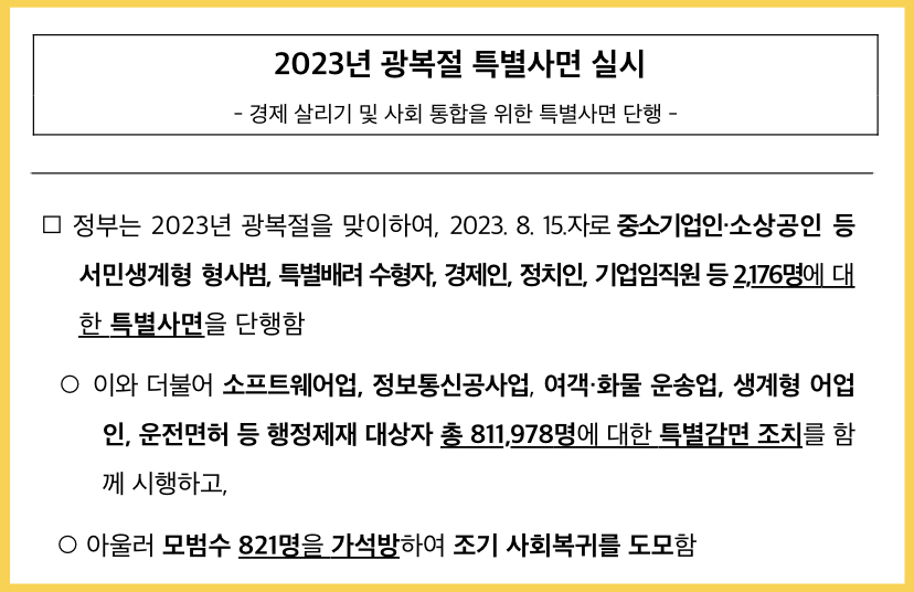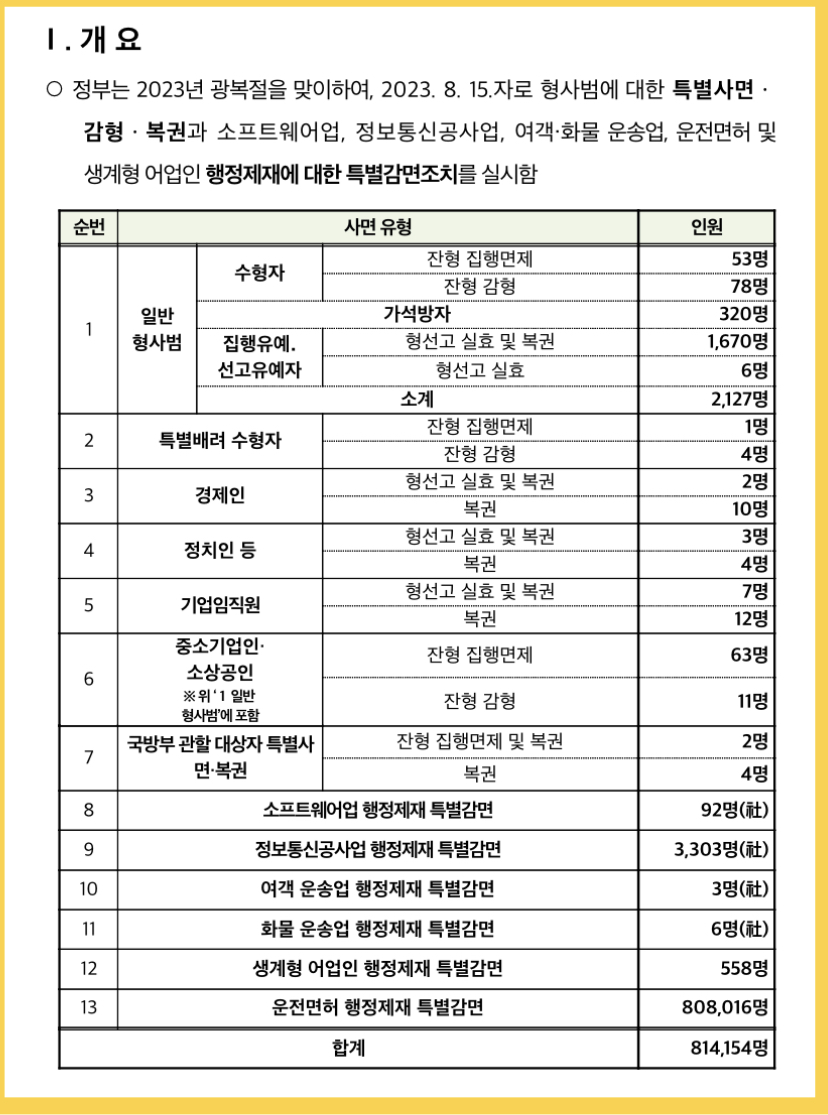 정부는 2023년 광복절을 맞이하여, 2023. 8. 15.자로 형사범에 대한 특별사면ㆍ감형ㆍ복권과 소프트웨어업, 정보통신공사업, 여객·화물 운송업, 운전면허 및 생계형 어업인 행정제재에 대한 특별감면조치를 실시합니다.