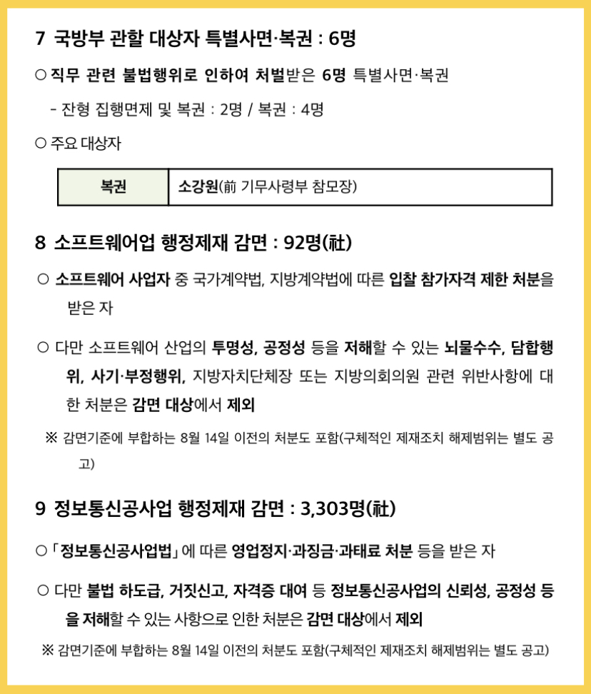 정부는 2023년 광복절을 맞이하여, 2023. 8. 15.자로 형사범에 대한 특별사면ㆍ감형ㆍ복권과 소프트웨어업, 정보통신공사업, 여객·화물 운송업, 운전면허 및 생계형 어업인 행정제재에 대한 특별감면조치를 실시합니다.