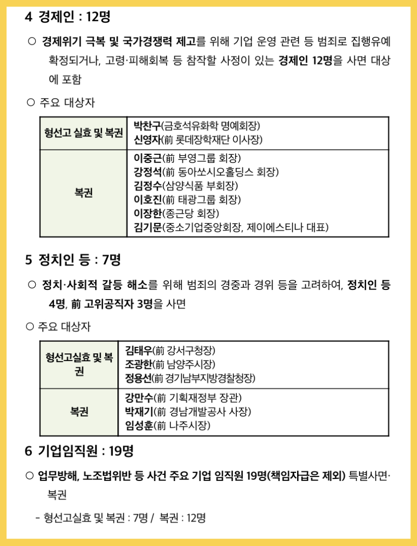 - 집행유예 기간 중인 1,670명은 형 선고의 효력을 상실시키고 그에 따른 임원 결격, 공무원 임용 제한 등 각종 자격 제한을 해제