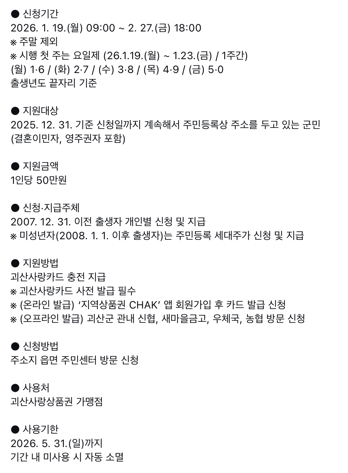 ※ 괴산군 민생안정지원금(‘26년 1월 중) 괴산사랑카드로 충전 지급 계획