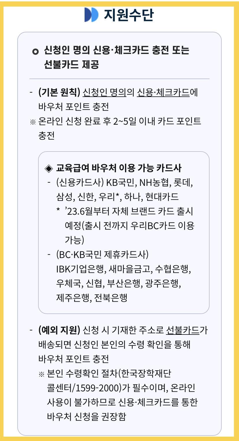 - 예외 지원: 신청 시 기재한 주소로 선불카드가 배송되면 신청인 본인의 수령 확인을 통해 바우처 포인트 충전. 본인수령확인 절차(한국장학재단 콜센터/1599-2000)가 필수이며, 온라인 사용이 불가하므로 신용·체크카드를 통한 바우처 신청을 권장함