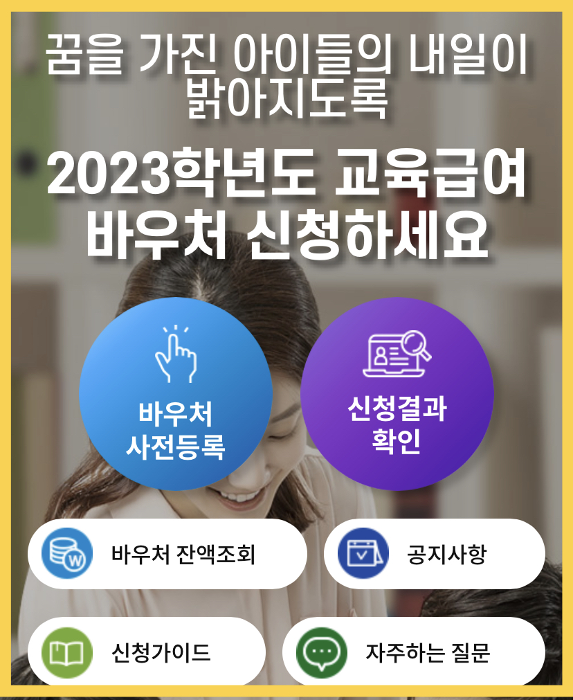 - 사전등록 기간: 2023. 3. 2.(목) ∼ 20.(월) 기존 교육급여 수급 가정이 ‘사전등록’ 기간 중 바우처 신청을 완료한 경우. ’23년 3월 중 카드바우처 포인트 우선 배정 예정