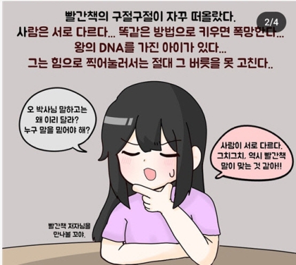 이 연구소가 공개한 홍보 웹툰에는 빨간책의 구절구절이 떠올랐다. 사람은 서로 다르다. 똑같은 방법으로 키우면 폭망한다. 왕의 DNA를 가진 아이가 있다. 힘으로 찍어눌러서는 절대 그 버릇을 못 고친다고 말하고 있습니다.