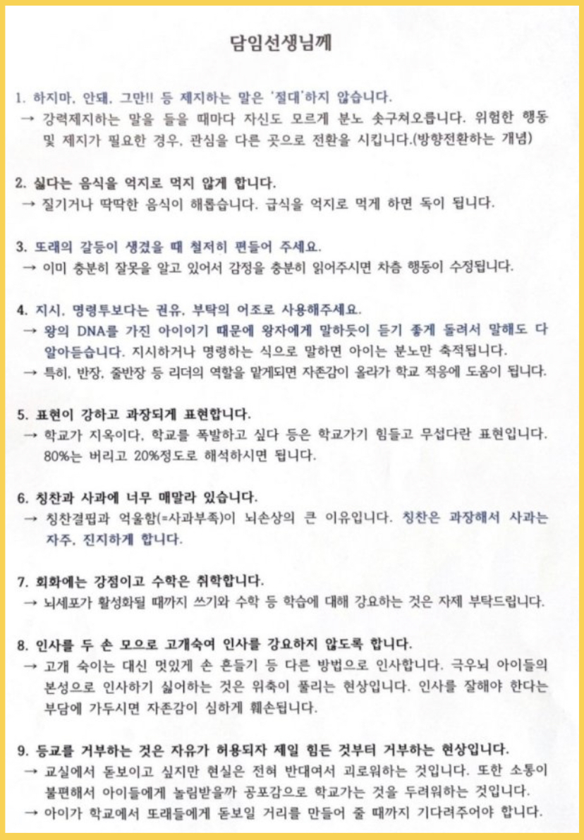 교육부 사무관인 부모는 담임교사에게 자신의 아이가 왕의 DNA가 있는 아이니, 왕자에게 말하듯이 말하라는 내용의 편지를 보냈습니다. 또한, 지속적으로 생활지도를 간섭하는 민원을 제기했는데요.