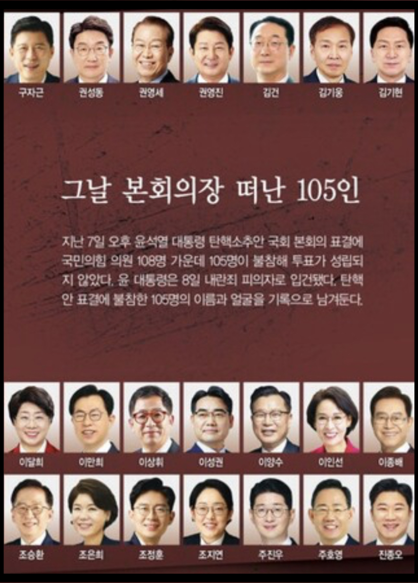 국민의힘 의원 108명 중 105명은 12월 7일 윤석열 대통령 탄핵소추안이 상정되자 국회 본회의장을 떠나 돌아오지 않았습니다.