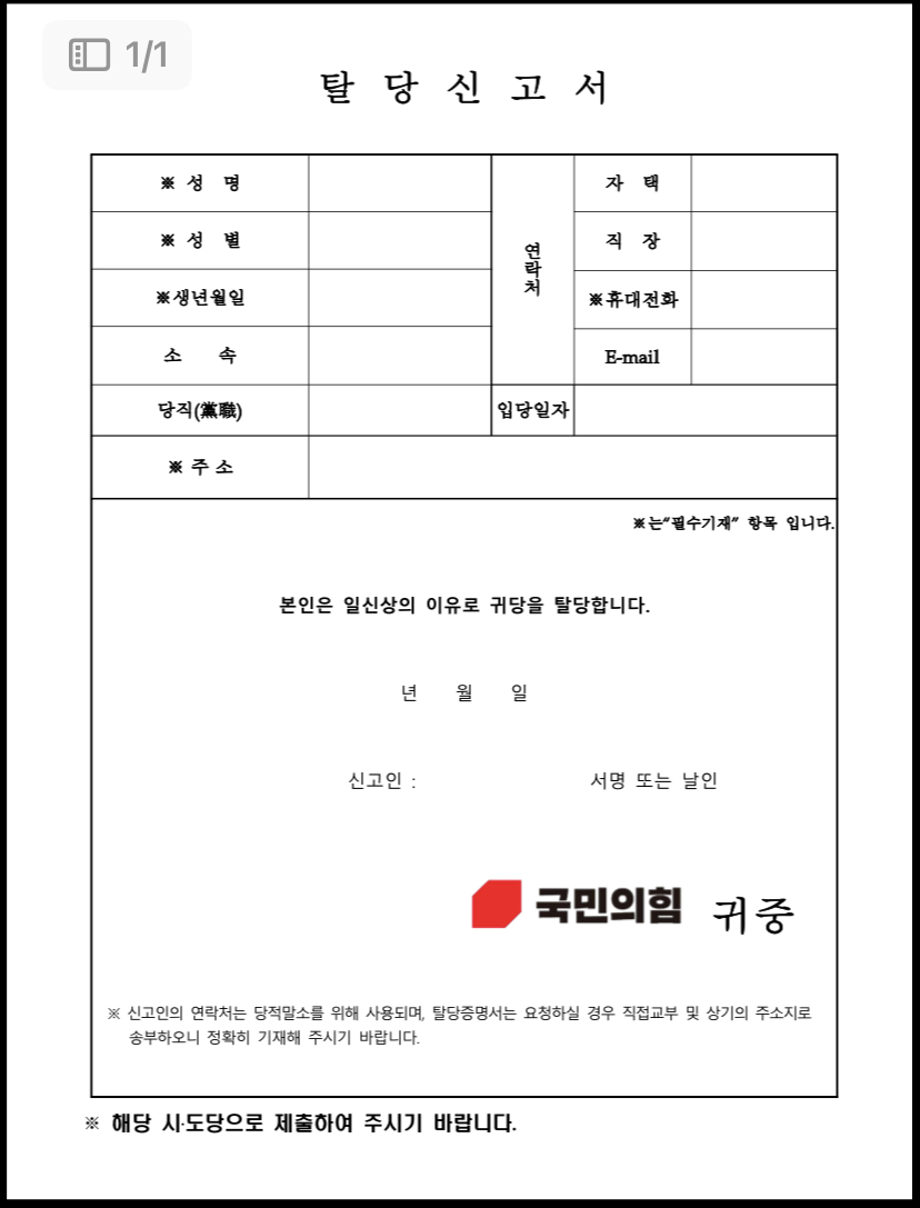 국민의힘 탈당 신고서