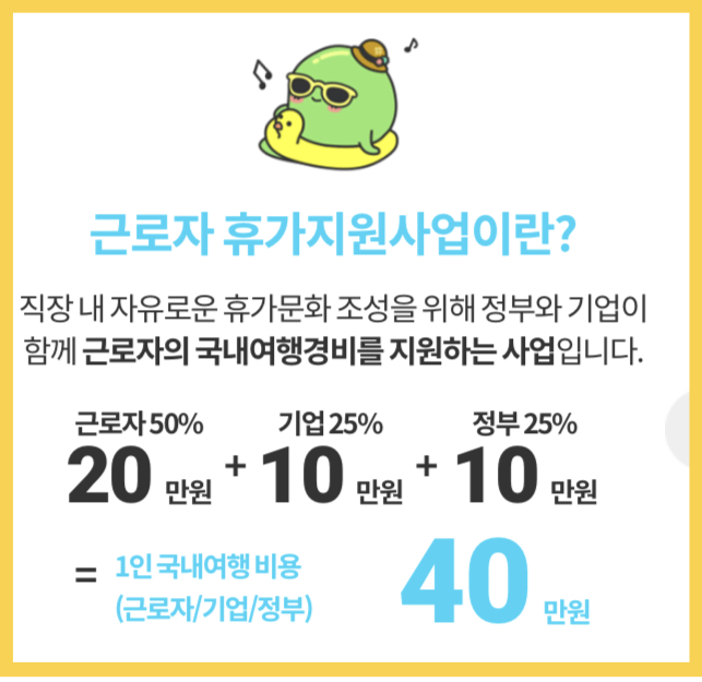 본인 20만원+회사 10만원+정부 10만원으로 총 40만원의 포인트 형태로 적립된 금액은 전용 온라인몰인 휴가샵에서 사용이 가능합니다. 내수 활성화이므로 해외 여행은 지원하지 않으며, 숙박시설, 입장권, 렌터카 기차 항공 등 국내 여행에 필요한 대부분의 제휴사를 갖추고 있습니다.