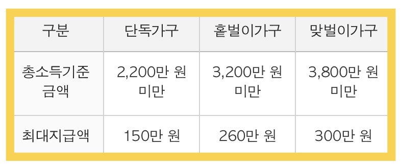 근로, 사업, 종교인, 기타소득, 이자, 배당, 연금을 모두 합한 후 신청자격 기준에 해당되는지 판단할 수 있습니다. 단독가구는 2200만원 이하여야하며 배우자, 부양자녀, 70세 이상의 직계존속은 없은 가구입니다. 최대 지급액은 150만원입니다.