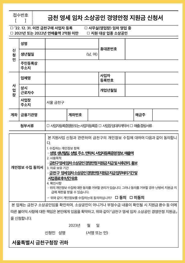 금천 영세 임차 소상공인 경영안정 지원금 신청서