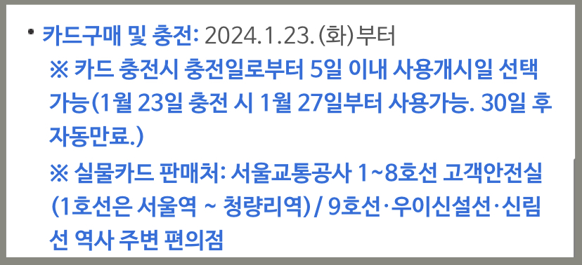1월 23일부터 서울교통공사에서 운영하는 1호선 서울역에서 청량리역 구간과 서울지역 2호선에서 8호선까지 역사 고객안전실에서 현금으로 3천원에 구매하신 후 역사 내 충전단말기에서 현금으로 충전하시면 됩니다.