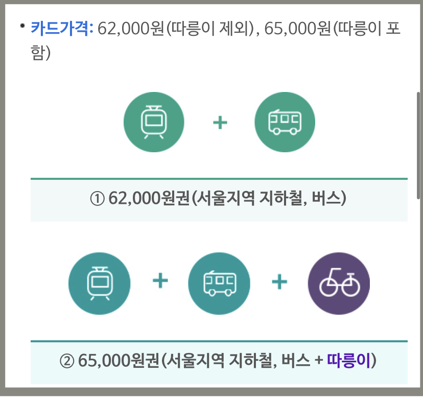 - 카드종류와 가격: 62,000원(서울지역의 지하철과 버스)65,000원(서울지역의 지하철과 버스+따릉이)