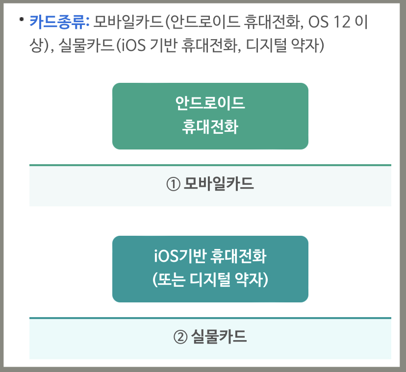 모바일카드는 안드로이드 휴대전화를 이용하시는 분만 사용이 가능하며, 실물카드는 ios 기반의 휴대전화와 디지털 약자분들이 사용 가능합니다.