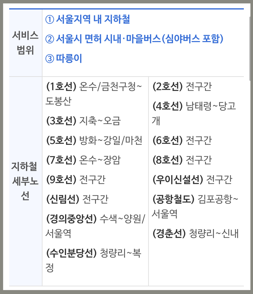 - 이용범위: 서울지역 지하철, 서울시 면허 시내 마을버스, 따릉이