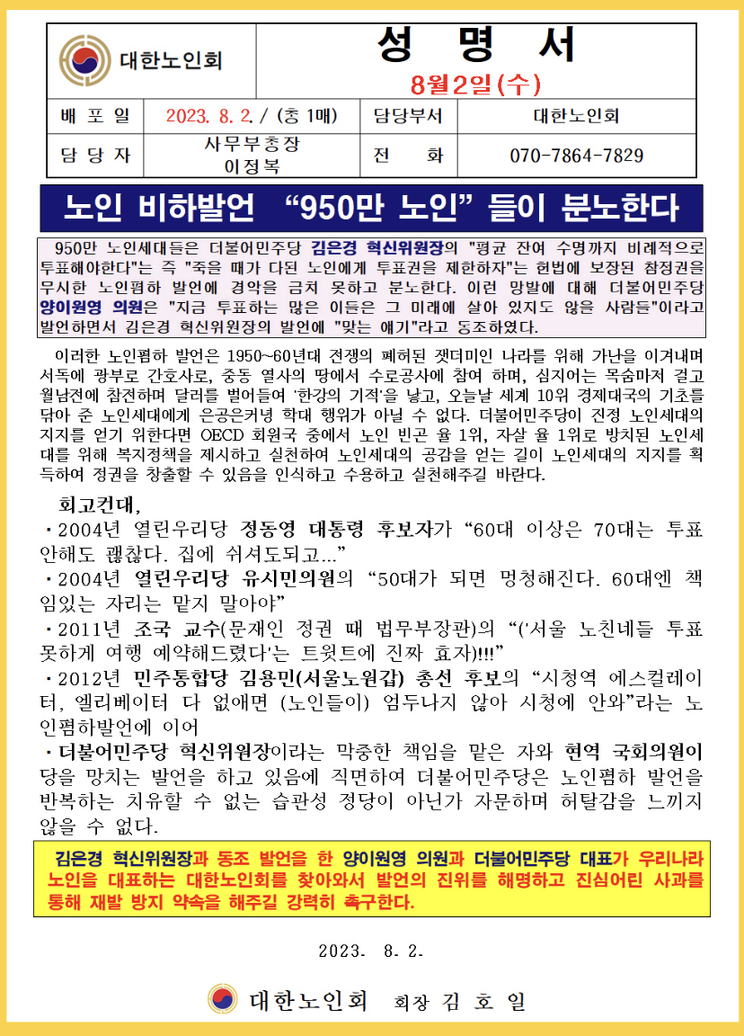 지금까지 김은경 혁신위원장 노인 폄하 비하 논란 대한노인회 사과 정리에 대해 살펴봤습니다. 아무쪼록 원만하게 해결되었으면 좋겠습니다.