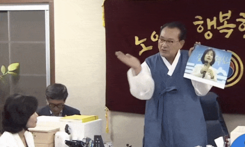 이에 김호일 회장은 내가 볼때기라도 때려야 우리 노인들의 분이 풀리는데, 손찌검하는 것은 안 되니 사진이라도 뺨을 때리겠다고 하면서 김은경 위원장 사진을 손으로 때렸습니다.