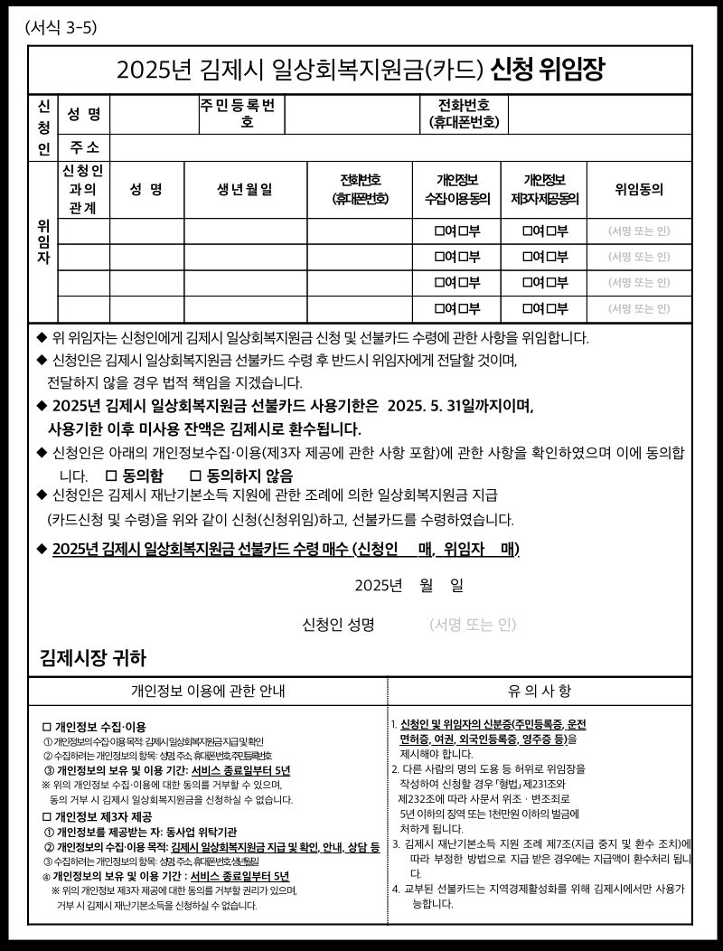 위임장 양식: 김제시 홈페이지 공지사항(일상회복지원금 신청 안내) 확인 및 읍면동 행정복지센터 비치되어 있습니다.