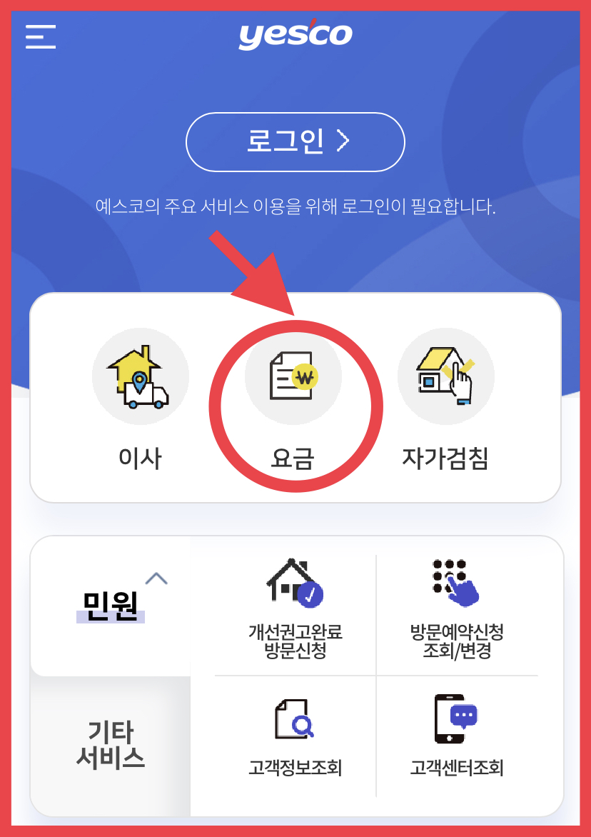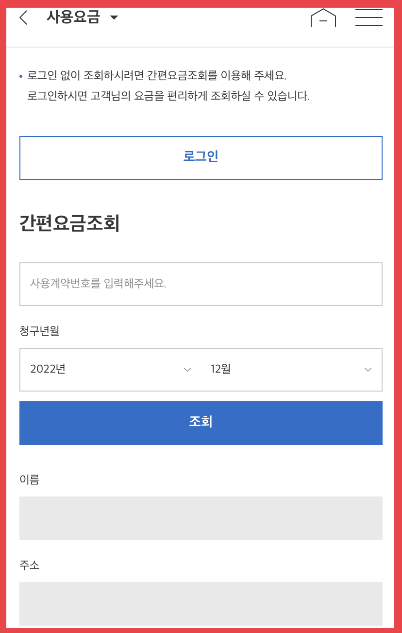 - 관할사이트 이동되면 메인화면에 요금조회 버튼 클릭