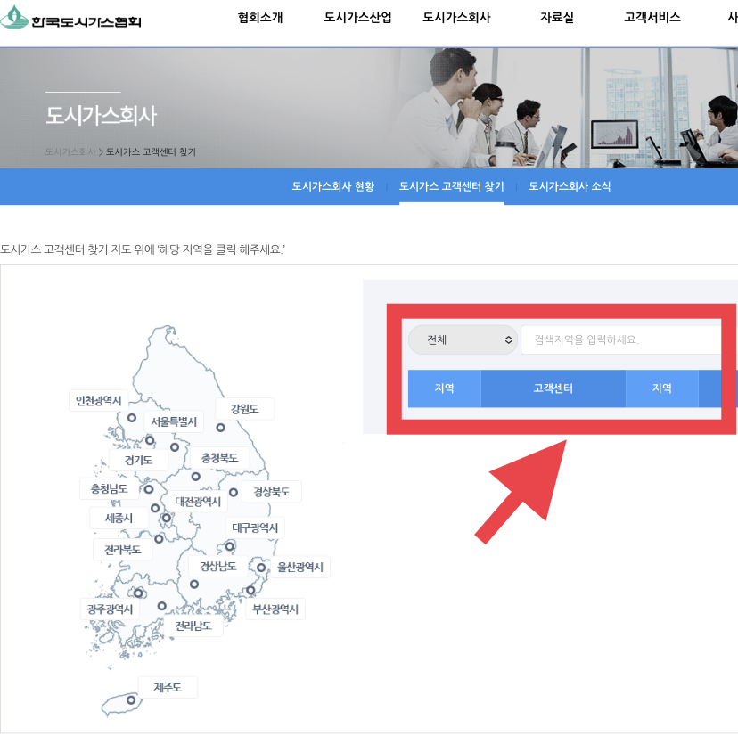 한국도시가스협회 홈페이지에 접속하여 메인화면에, 고객센터 찾기를 눌러줍니다. 그리고, 본인이 거주하는 지역을 선택해 주시면 되는데 무슨 구인지까지 자세하게 선택을 해주시기 바랍니다. 본인이 거주하는 지역을 검색하시고 선택하시게 되면, 거기에 해당하는 관할 사이트로 연동이 됩니다.